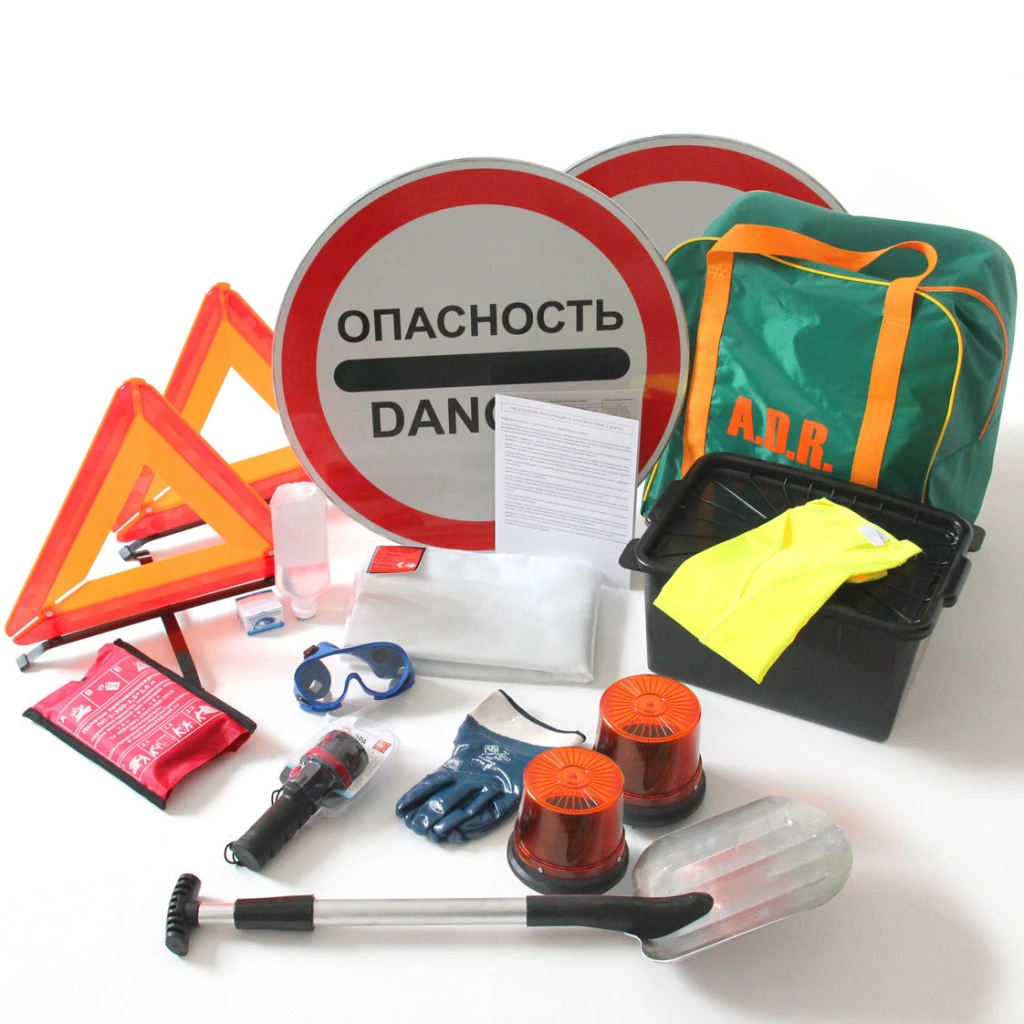 Комплект включает обязательные средства оснащения, которые должны находиться на борту транспортного средства, перевозящего такие грузы, в соответствии с требованиями Европейского соглашения о международной дорожной перевозке опасных грузов (ДОПОГ).