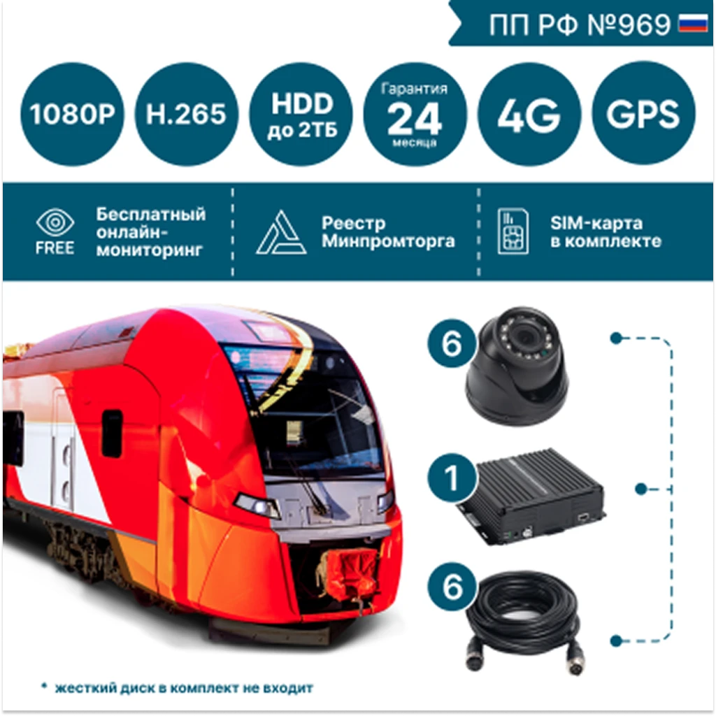Комплект видеонаблюдения на 6 камер NSCAR BUS601 FullHD_HDD с опциями 4G+GPS/Глонасс